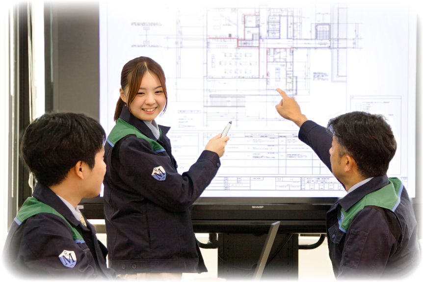 現在も、総務部、土木部等で女性が働いていますが、女性社員がより働きやすいように、また、女性の就職希望者が当社を選びやすいように女性活躍推進法※)に基づく「一般事業主行動計画」を策定しました。この計画は令和2年2月1日からの3カ年計画で①女性技術者の採用増と②労働時間等の働き方の改善を目指しています。