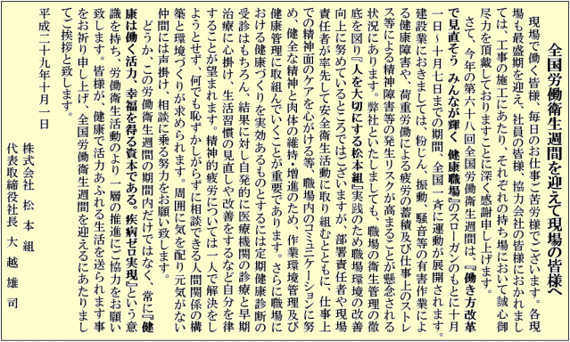 平成29年度全国労働衛生週間が10月1日から10月7日まで実施されました。今年は「働き方改革で見直そう みんなが輝く 健康職場」をスローガンに全国一斉に運動が展開されました。