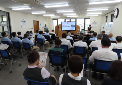 今回の訓練では「函館で震度5弱の地震が発生し、勤務中に3階給湯室で火災が発生した」という想定のもと、初期消火が困難な状況を踏まえて館内放送による火災発生の周知と避難誘導を行い、全社員が速やかに駐車場へ避難しました。避難後は、LINEWORKSを活用した安否確認訓練を実施し、さらに消火訓練を行いました。また、「かえるばしょ」代表・防災アドバイザーの鈴木早織様を講師にお迎えし、安全(防災)講話を行っていただきました。