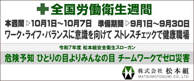 2025年度全国労働衛生週間が10月1日から10月7日まで実施されました。今年は「ワーク・ライフ・バランスに意識を向けてストレスチェックで健康職場」をスローガンに全国一斉に運動が展開されました。