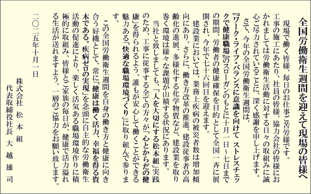 これから冬季に向けて、現場条件は一層厳しくなりますが、当社では引き続き快適な職場環境の形成と「安全第一」を心掛け、全社員一丸となって安全衛生管理の向上に努めてまいります。
