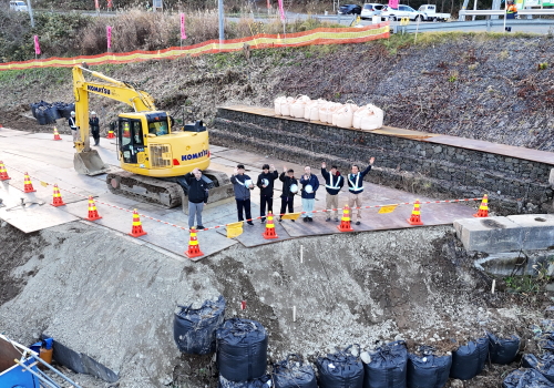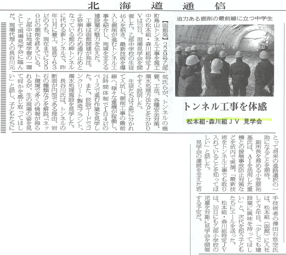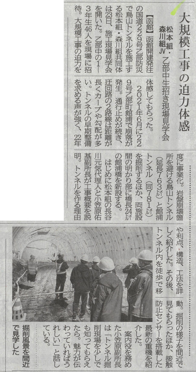 また、厚沢部中学校の生徒さんは、鳥山トンネル工事現場および萩茶里橋耐震補強工事現場で職場体験を実施しました。現場の見学に加え、担当者からの業務説明や作業の流れについて学び、建設業の仕事をより身近に感じていただく機会となりました。