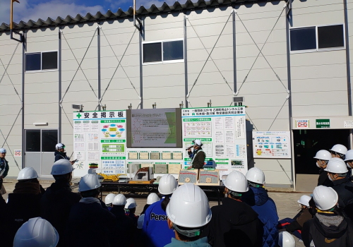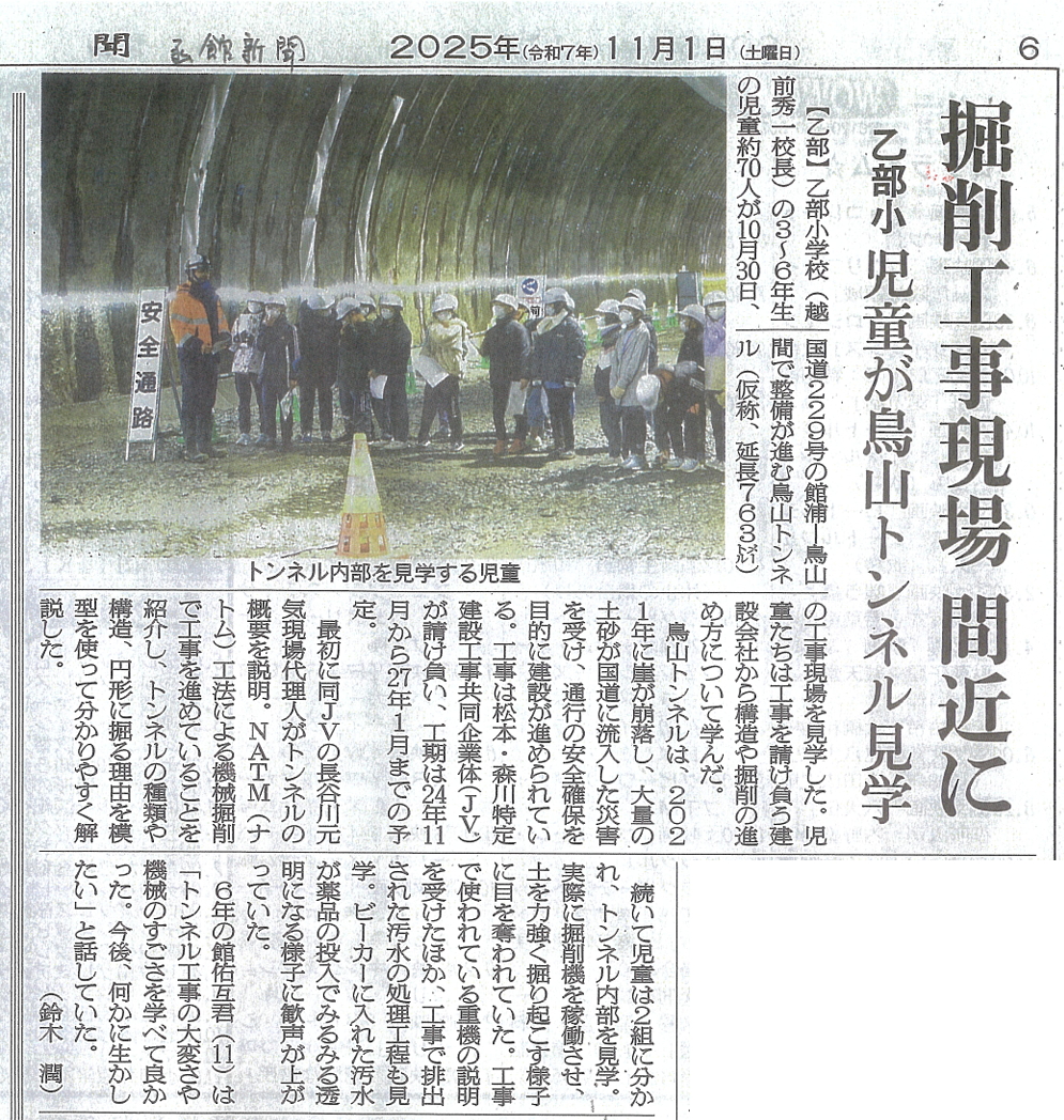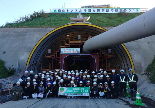 このたび、乙部小学校・乙部中学校の生徒の皆さんが、鳥山トンネル工事の見学会に来訪されました。実際の施工現場を見ていただきながら、工事の概要や安全への取り組みについて説明し、質疑応答では多くの質問が寄せられました。生徒の皆さんは真剣に話を聞き、現場の臨場感に大きな関心を示していました。