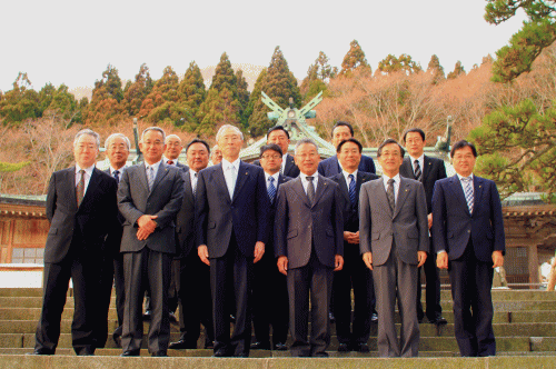 本社会議室にて行われた仕事初め式に引き続き、堀岡社長以下幹部社員が函館八幡宮の神前にて今年一年の無事故無災害と社員並びご家族の健康、社業発展を祈念しました。